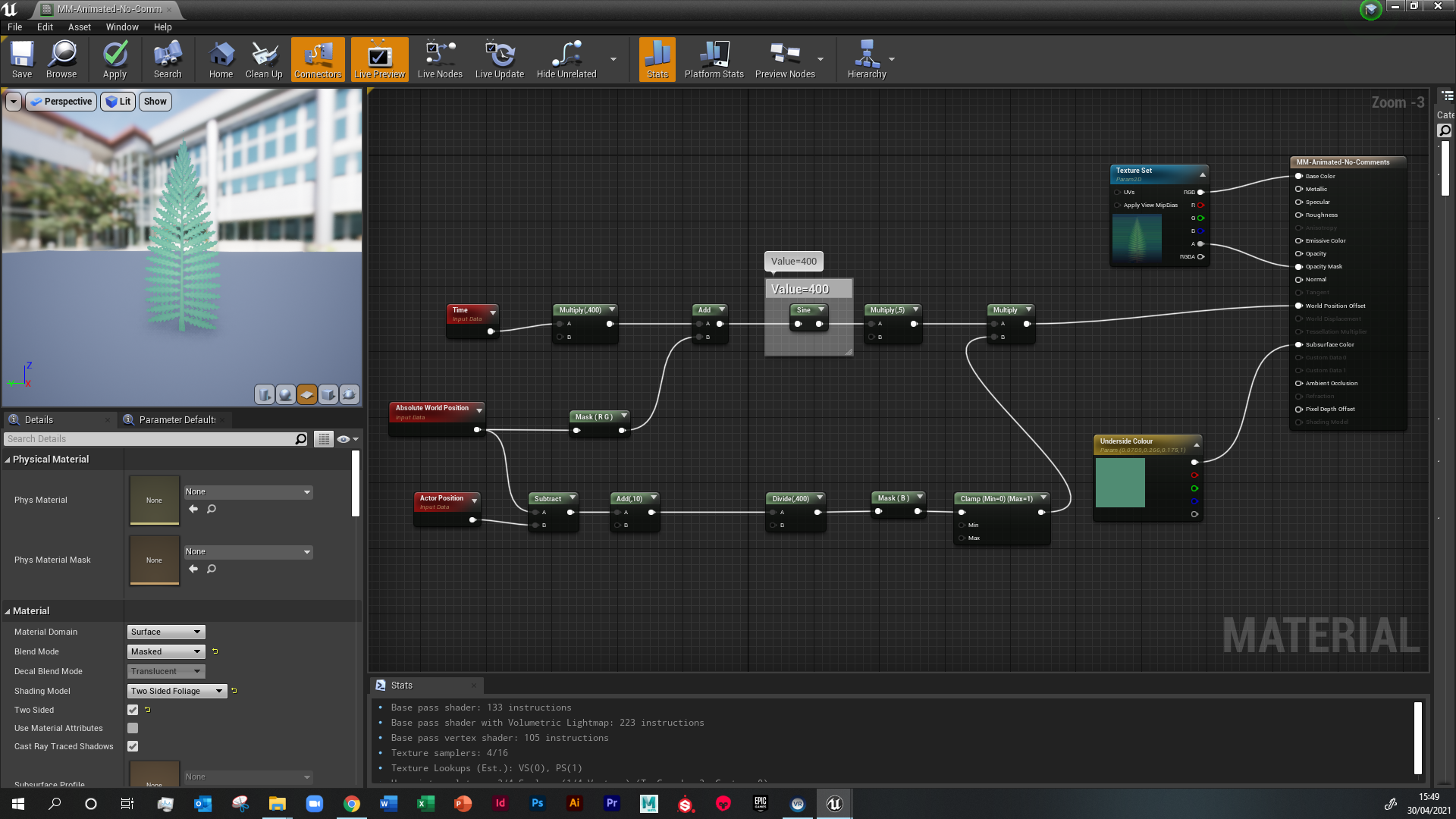 This shader animates a single texture by applying a Sine Wave onto the X & Y coordinates over time, creating the appearance of wind. The same texture is applied to the whole plant. The centre point of the static mesh is then anchored to to the ground so that the plant moves with a sense of realism.