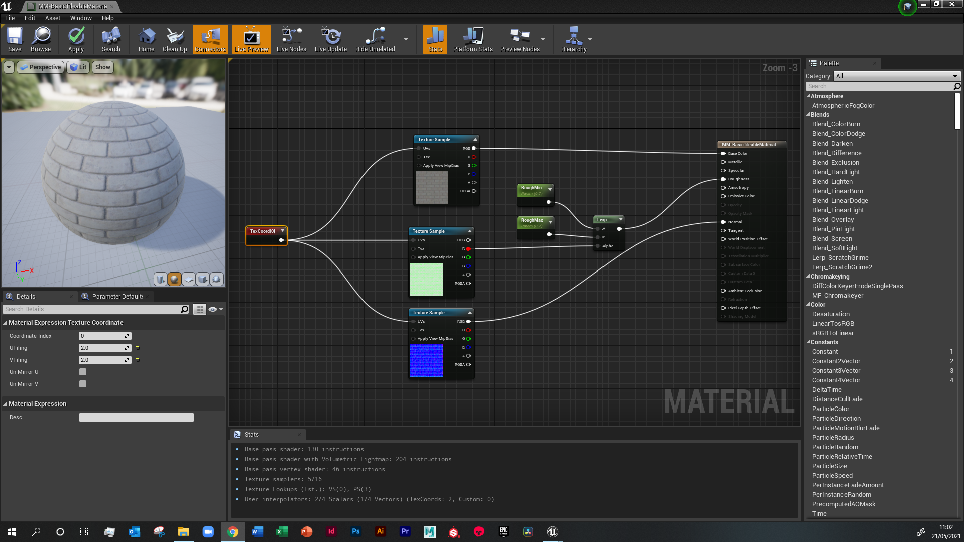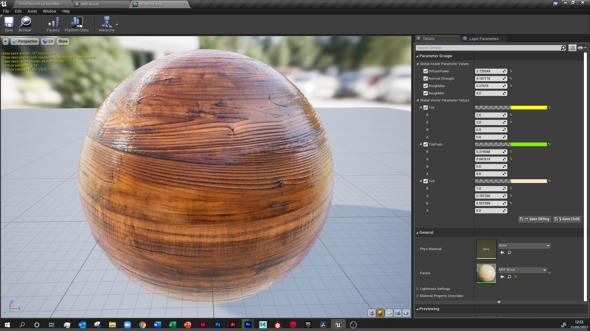 This takes a wooden material and normal map and makes configurable parameters for tiling, tinting, roughness/shine, normal strength.