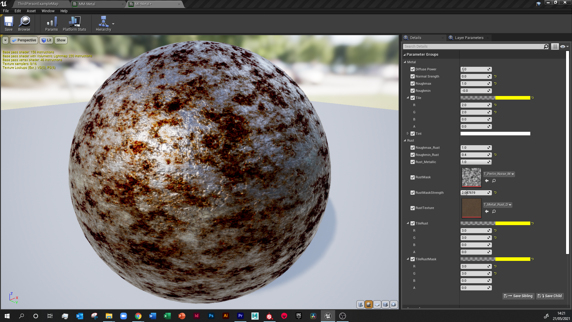 This material blends steel and rust using a noise mask across every material node. All three textures can be individually tiled to create different appearances. The albedo, normal and roughness channels all have intensity parameters. The roughness is built from the albedo. The metalness can be adjusted. The result is a huge number of variations to the texture can be made and deployed across different material instances within a project.