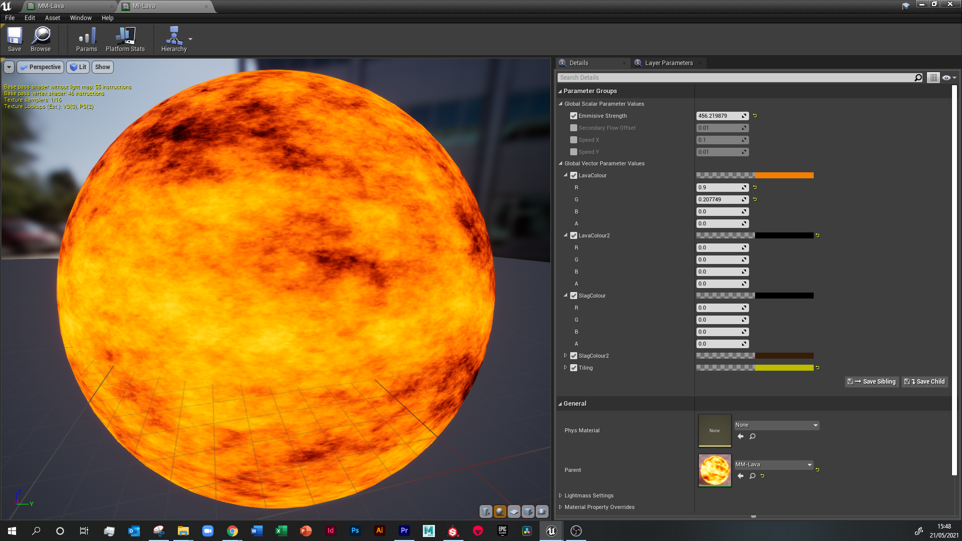 This is a basic lava material which is built by panning a noise texture with colours plugged into the A and B channels of a lerp. Two similar textures are offset in hue, intensity, location and rotation and multiplied together in order to create a more dynamic animated lava effect.